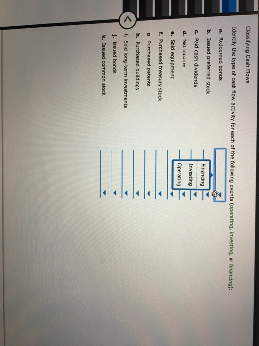 Classifying cash flows. Classifying Cash Flows Identify the type of cash flow activity for each of the following events operating investing or financing. A cash flow statement provides information about the changes in cash and cash equivalents of a business by classifying cash flows into operating investing and financing activities. The classification of cash flows is carried out by identifying the cash flow with one of three business activities.